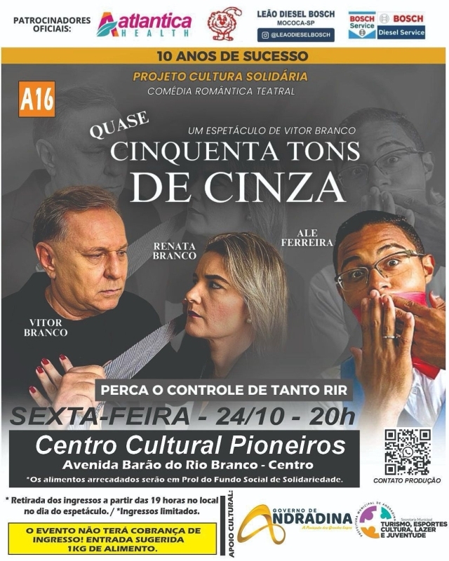 👉 ENTRAR NO CANAL GRATUITO Seu número fica oculto e protegido.Prepare-se para uma noite de puro entretenimento, risos soltos e boas intenções! A comédia “Quase Cinquenta Tons de Cinza”, estrelada e escrita por Vitor Branco, nome conhecido por seus trabalhos no teatro e na televisão, será apresentada em Andradina no dia 24 de outubro (sexta-feira), às 20h, no Centro Cultural Pioneiros.