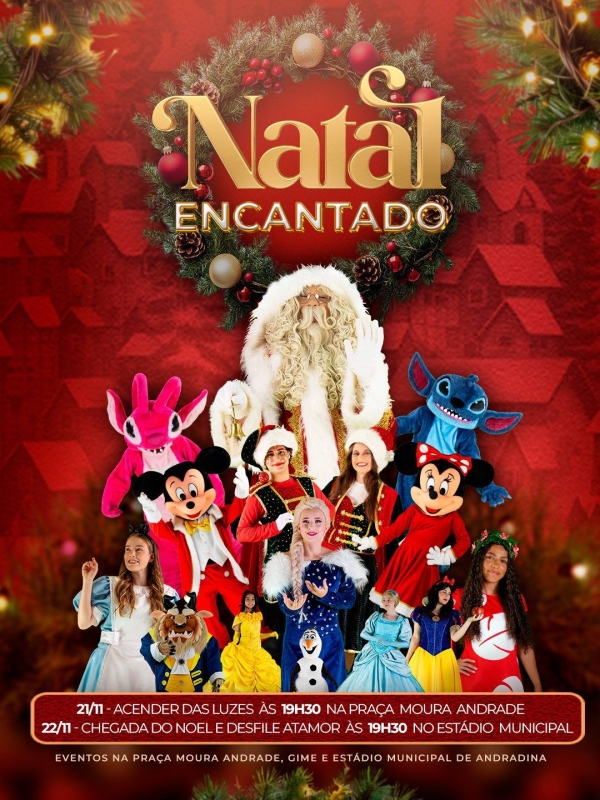 👉 ENTRAR NO CANAL GRATUITO Seu número fica oculto e protegido.A programação oficial do Natal 2025 em Andradina começa no dia 21 de novembro, às 19h30, com o tradicional Acender das Luzes de Natal na Praça Moura Andrade. O evento, considerado o momento mais simbólico das celebrações, transforma a praça em um dos principais cartões-postais da cidade durante o período festivo. A abertura contará com apresentação do Projeto Guri, cantata natalina e um especial show de harpa paraguaia, dando o tom das atividades que seguem até dezembro.