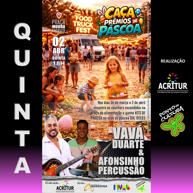 A programação começa no dia 2 de abril com show de Vavá Duarte e Afonsinho da Percussão. Na mesma data, haverá uma atração especial voltada ao público infantil: uma caça de prêmios de Páscoa, onde as crianças poderão procurar presentes escondidos pela praça, tornando a experiência ainda mais divertida.