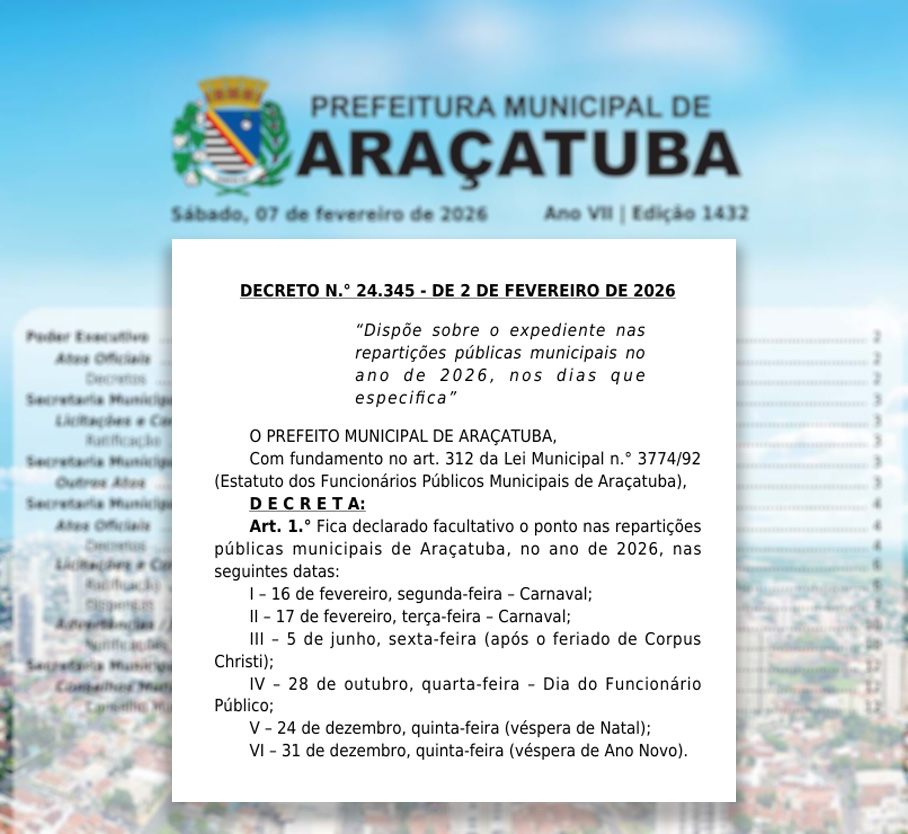 Diário Oficial traz decreto com os pontos facultativos para os servidores municipais de Araçatuba em 2026