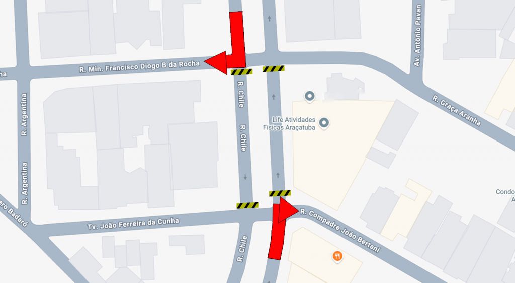 A Prefeitura de Araçatuba, por meio da Secretaria Municipal de Mobilidade Urbana, informa que a Rua Chile, no Bairro Icaray, será interditada nesta sexta-feira (27), entre 12h e 23h, na altura do número 1.561, nos dois sentidos, entre as ruas Compadre João Bérgamo e Ministro Francisco Diogo B. da Rocha.
