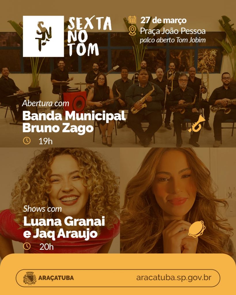As cantoras Luana Granai e Jaq Araújo se apresentam nesta sexta-feira (27), no palco do Teatro Aberto Tom Jobim, da Praça João Pessoa, durante o “Sexta no Tom”. O projeto é realizado pela Prefeitura de Araçatuba, por meio da Secretaria Municipal de Cultura.