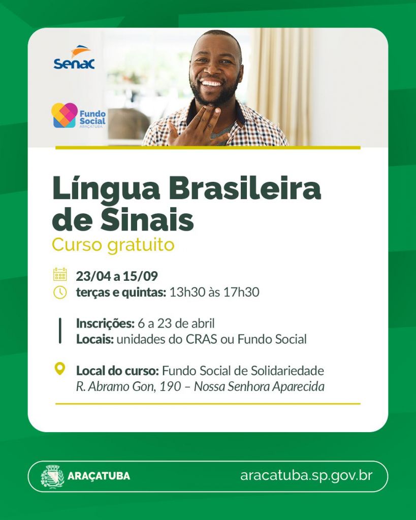 São 20 vagas disponíveis para o curso de Libras. É necessário ter acima de 13 anos, ensino fundamental 1 completo, além de saber ler, escrever e interpretar textos. O objetivo é preparar ouvintes para se comunicarem com pessoas surdas, conhecendo o universo visual, aspectos da cultura e identidade delas.