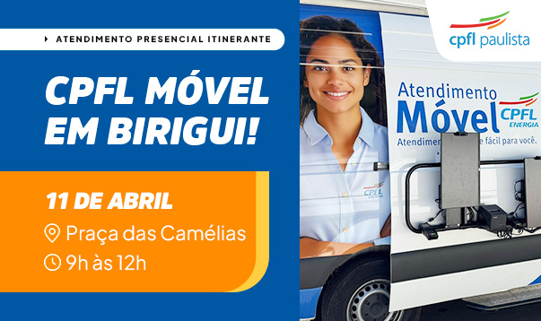 A Prefeitura de Birigui informa que irá receber no próximo sábado, dia 11 de abril, a Agência Móvel de Atendimento da CPFL Paulista. O veículo ficará estacionado na Praça Das Camélias/Bíblia, das 9h às 12h.